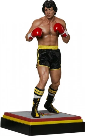 Steigen Sie mit Rocky Balboa in den Ring, dessen ikonische Leinwandpräsenz in einem extrem detaillierten und lebensechten Sammlerformat im Maßstab 1:3 eingefangen wurde. Mit einer Größe von 25,7″ stellt die Rocky II Statue den durchtrainierten Schwergewichtsboxer so dar, wie er in seinem zweiten Filmauftritt im mit Spannung erwarteten Rückkampf gegen Apollo Creed auftrat. Er steht auf einem strukturierten schwarz-gelb-rot-grauen Sockel mit einem Stern in der Mitte, der das Gefühl der Boxring-Leinwand einfangen soll. Sein Porträt wurde fachmännisch nach dem Vorbild des Schauspielers Sylvester Stallone modelliert und verfügt über handgefertigte, hyperrealistische, bewegliche Augen für einen zusätzlichen Grad an Realismus in jeder Sammlung.