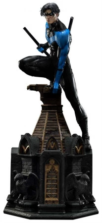 Inspiriert von der Kunst von Jim Lee, ist Nightwing eine wunderschön gearbeitete Statue mit außergewöhnlicher Liebe zum Detail, sehr ähnlich wie die Comic-Kunst. Die Basis ist von der Spitze des Gebäudes Turm steht etwa 34 Zoll hoch, hält seine Unterschrift Waffen, die Zwillingskampfstöcke, Escrima Sticks.