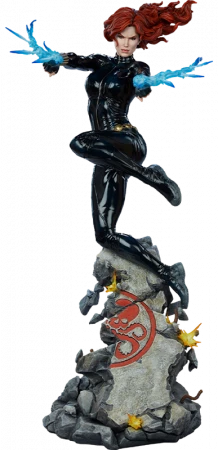 Die Black Widow Premium Format Figur ist 23″ groß und zeigt Natasha Romanoff, wie sie die Wand einer geheimen Hydra-Einrichtung hinunterrutscht und orangefarbenen Feuerstößen ausweicht, da Tarnung keine Option mehr ist. Ihr charakteristisches rotes Haar fließt dramatisch, während sie eine waghalsige Flucht durch felsige Trümmer unternimmt und blaue Elektroschocks von ihren Widow’s Bite Armbändern abfeuert. Hydra wird nicht wissen, was sie getroffen hat!